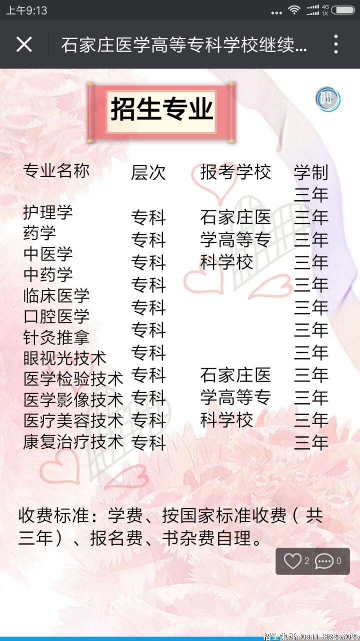 收费标准:学费:每年1100元(共三年),报名费,录取费、书杂自理。 三、报考成人专、本科的优势: 1、可以缩短参加执业医师、执业护师考试年限:中专毕业考取执业助理医师、执业护士证后参加执业医师、执业护师考试需五年后,才可以参加考试。而取得大专毕业证后三年即可参加执业医师、执业护师考试,比中专毕业缩短两年;取得本科毕业证后,当年即可参加执业医师、执业护师考试,比大专缩短三年。2、目前用人单位工资待遇,本科生要比专科生月工资多300元左右,专科生比中专生多200左右,取得专、本学历后便于就业,同时工资待遇也有所提升。3、中专生取得执业医师、执业护师证后不能再提高副高级以上职称。而取得专科、本科毕业后,还可以继续提高职称,如主治医师、主治护师,副主任医师、副主任护师,主任医师、主任护师。4、本科毕业可以继续报考研究生。而专科不可以参加。5、学习方式:以自学为主,辅导为辅的学习方式四、考生报名方法及条件。1、来人、来函、来电均可,统一填写“石家庄医学高等专科学校成人教育学院新生报名登记表”,由学院统一网上报名及填报志愿,同时提交本人身份证复印件两张、蓝底小二寸照片六张,报考本科专业学生需提供国家承认学历的专科毕业证复印件两张(如专科毕业证书复印件不予承认学历,后果自负)。2、即日起即可报名;3、在校中专生、应、往届中专毕业生、社会上有中专学历或无学历在职医、护人员均可以报考专科相关专业,应、往届专科毕业生、社会上有专科学历的医、护人员均可以报考本科相关专业。4、现场确认时间,8月底9月初。