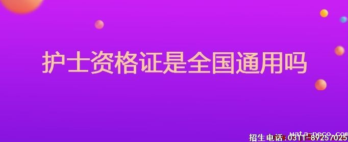 护士资格证全国通用。通过护士执业资格考试并合格者,由各省、自治区、直辖市人事(职改)部门颁发人事部统一印制,人事部、卫生部用印的专业技术资格证书。该证书在全国范围内有效。 护士执业资格考试基本介绍: 护士执业资格考试由卫生部负责组织实施。国家护士执业资格考试是评价申请护士执业资格者是否具备执业所必须的护理专业知识与工作能力的考试。 在中等职业学校、高等学校完成国务院教育主管部门和国务院卫生主管部门规定的普通全日制3年以上的护理、助产专业课程学习,包括在教学、综合医院完成8个月以上护理临床实习,并取得相应学历证书的,可以申请参加护士执业资格考试。 护士执业资格考试实行国家统一考试制度。统一考试大纲,统一命题,统一合格标准。考试采用人机对话的考试形式进行。护士执业资格考试包括两个科目:《专业实务》和《实践能力》。在一个考试年度内通过两个科目的考试可取得证书。 护士执业资格实行注册制度。护士经执业注册取得《护士执业证书》后,方可按照注册的执业地点从事护理工作。未经执业注册取得《护士执业证书》者,不得从事诊疗技术规范规定的护理活动。 华体汇登录首页考护士证和考驾照一样,好好学习专业知识,该背对背,该记得记住,每年通过率是很高的。护士资格证是在中专第三年报考,内容不会太难。即便第一年不考,可以中专以后就业或者大专毕业在考都可以。 华体汇登录首页咨询电话:0311-89257025、13383115636 、15383298687 华体汇登录首页微信号:13383115636 杨老师、15383298687李老师 华体汇登录首页咨询QQ:1428427717 了解更多专业详情可点击查看>>华体汇登录首页招生简章
