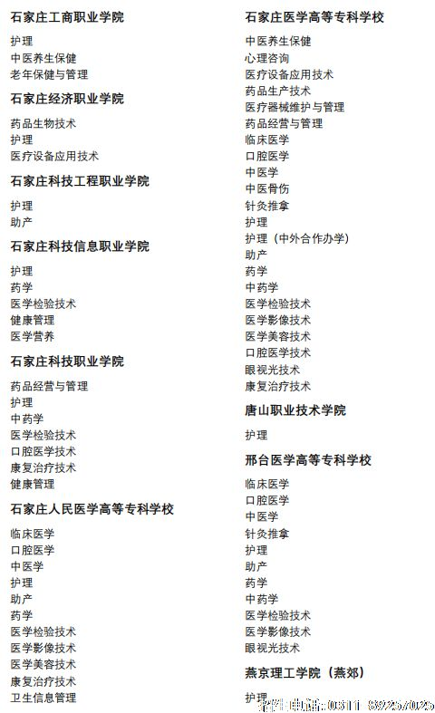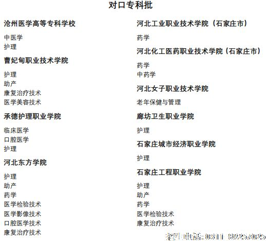 医学类对口河北省医学类对口升学专科批次的专业和学校名单