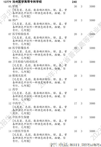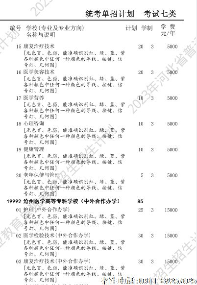 沧州医学高等专科学校2023年单招考试七类和对口医学类招生计划及录取分数线沧州医学高等专科学校 2023年单招考试七类和对口医学类招生计划和录取分数线汇总 沧州医学高等专科学校始建于1958年,是一所以医药卫生教育为主的公办全日制普通高等专科学校,是中国特色高水平高职学校和专业建设计划(“双高计划”)高水平专业群(临床医学专业群)建设单位、全国护理专业技能型紧缺人才培养基地、全国卫生行指委健康管理专业分委会主任委员单位、河北省卫生职业教育集团理事长单位、河北省优质专科高等职业院校。 近年来,学校在教育部高职院校人才培养工作评估中被评为优秀院校,获得全国文明单位、全国急救教育试点学校、全国绿化模范单位、全国红十字模范校、全国职业院校护理专业仪器设备装备规范河北省示范学校等荣誉称号。 学校连续七年作为河北省高职单招考试七类和对口医学类联考单招牵头院校,单招、对口、普招类录取分数在河北省医药卫生类高职院校中名列前茅。学校人才培养质量优异,声誉显著,毕业生平均就业率在98%以上。 沧州医学高等专科学校口碑评价好不好 1、老师们治学严谨,要求严格 ,能深入了解学生的学习和生活状况,循循善诱,平易近人,注意启发和调动学生的积极性,课堂气氛较为活跃,上课例题丰富,不厌其烦,细心讲解,使学生有所收获。 2、学校环境优美,管理很严格,有小高四之称,老师教学水平高,实训条件很好,有跑操,学校里学生素质很高。我就读护理系,每年很多人就读,老师同学都很不错还有机会去学校附,属医院见习,收获很多,要求很严但有收获。 3、学校环境优美,老师教学水平比较高,管理严格, 教学条件好,教学硬件设施完全,开设专业也特别多, 在专科类医学院校里比较有名, 提供了非常多的实习岗位。 4、老师教学很不错,环境很好,实训条件很好,有跑操,学校里学生素质很高护理是大系,每年很多人就读,老师同学都很不错还有机会去学校附属医院见习,很好,收获很多,要求很严但有收获。 2023年河北省普通高职院校单独考上招生计划(沧州医学高等专科学校单招七类招生计划专业及招生人数) 2023年河北高职单招考试七类沧州医学高等专科学校最低分:458,中外合作最低分405,相对来说也不是很高。 2023年河北省高职单招对口医学类招生计划(沧州医学高等专科学校招生计划额人数要求) 2023年沧州医学高等专科学校单招对口类最低分数线446分 从高职单招和对口医学类计划来看,护理专业单招七类是30人,对口医学类是20人。如果同样报名护理专业,肯定是中专生报名对口类单招优势很多,虽然招生计划少10个但是对口单招类的报名人数少很多竞争也小。 在这里细节看出,你就算上了一个普通高中,以后走单招的话还是和上中专一样的道路,而且没有优势了,只能参加单招七类不能参加对口类招生计划,我们中专在校生可以参加单招七类也可以参加对口医学类,根据自己情况选择。多一层保障!