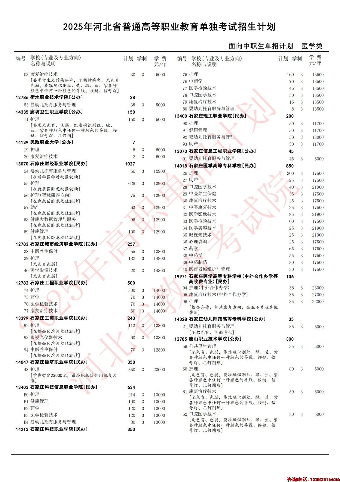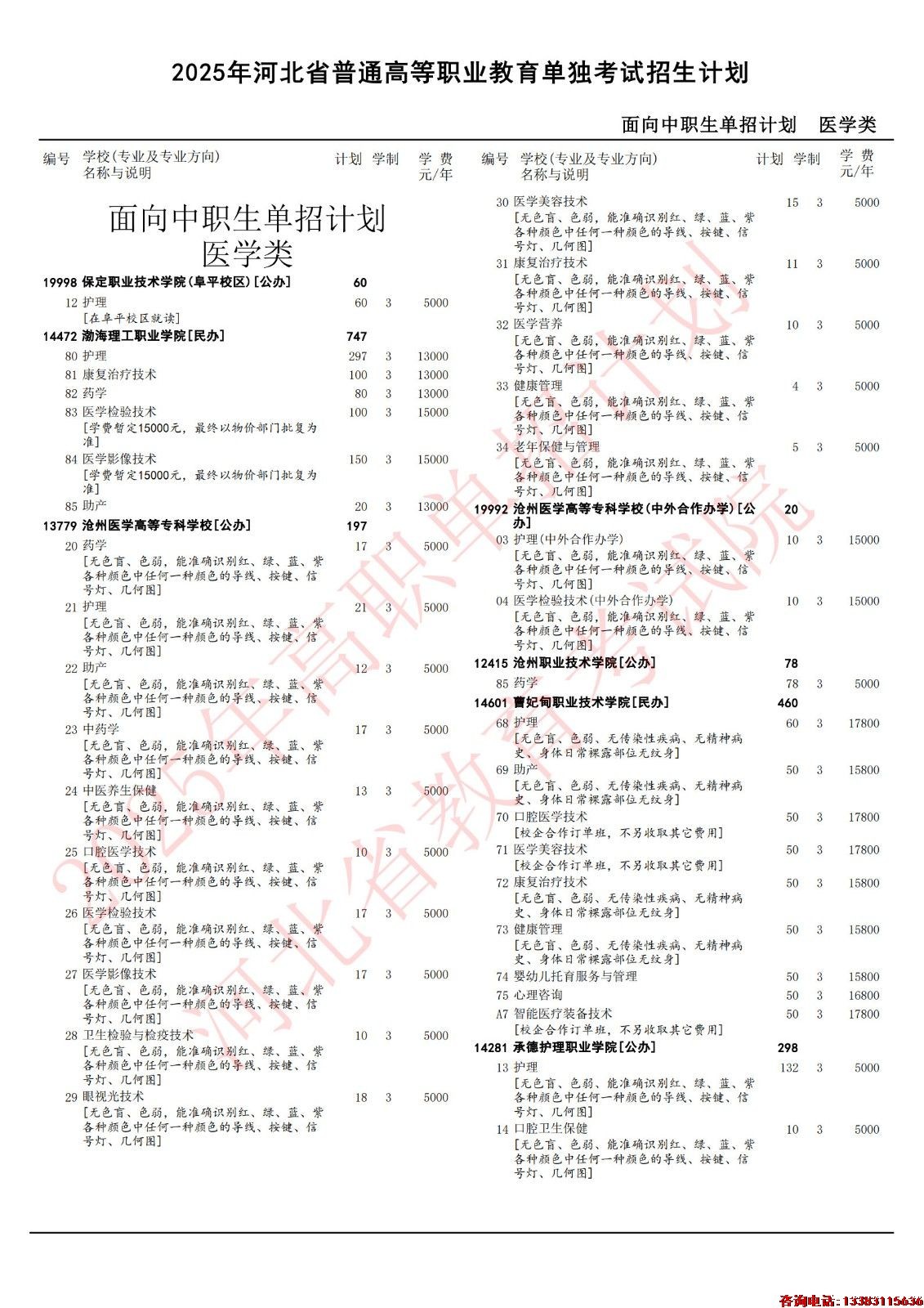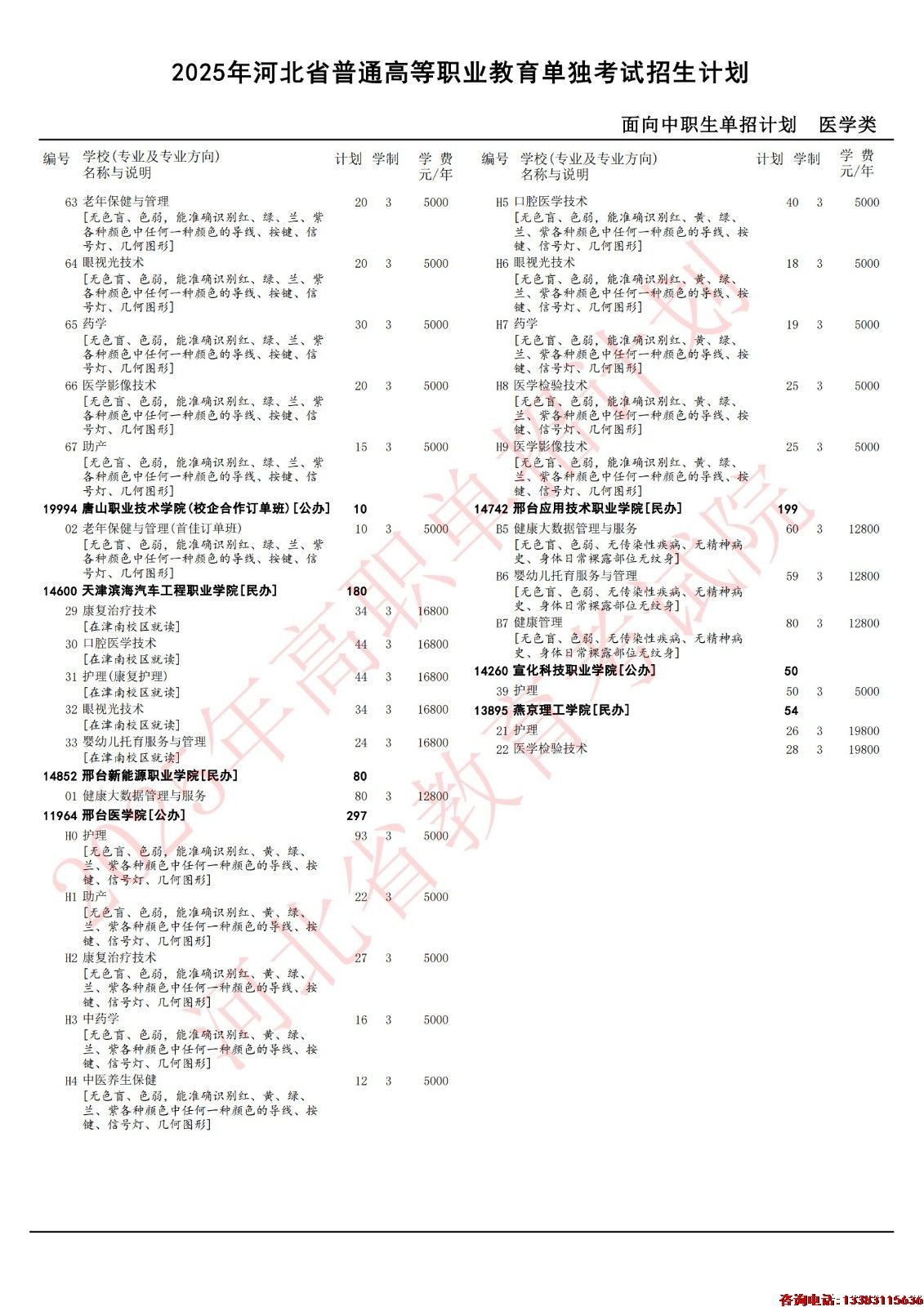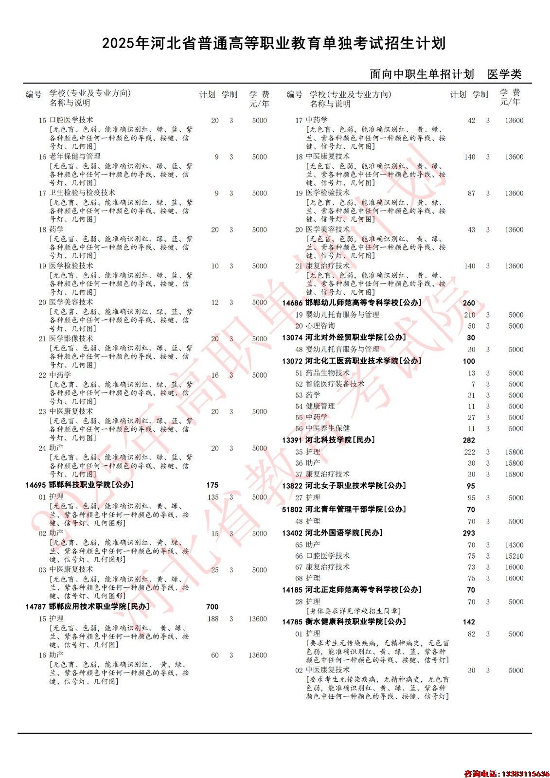 2025年河北单招医学对口类各院校招生计划(官方图)