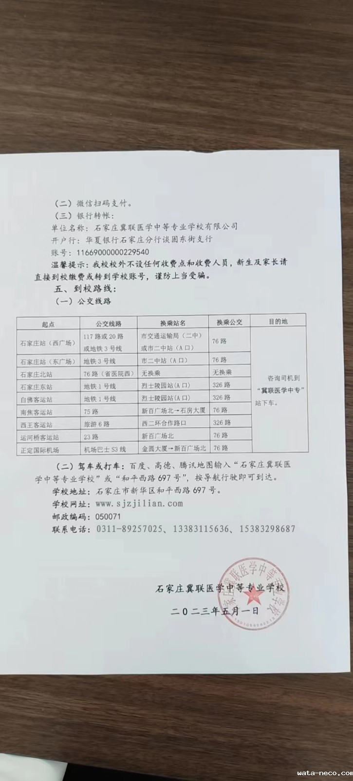 石家庄冀联医学中等专业学校2024级秋季新生入学须知石家庄冀联医学中等专业学校2024级秋季新生入学须知 亲爱的同学:恭喜你被石家庄冀联医学中等专业学校录取,现将有关报到事项 通知如下: 报到: 请于2024年8月17报到,不要提前或推迟。 二、报到时须携带的相关证件及要求: (一)报到时,须持本人录取通知书、户口迁移证(自愿)、居 民身份证(没有身份证的,可暂用户口本报到,并尽快办理身份证)、初中或高中毕业证。 (二)户口迁移证:新生凭《录取通知书》可在当地公安机关办理户口迁移手续。 迁移派出所:石家庄市公安局新华分局和平西路派出所。迁移地址:石家庄市新华区和平西路697号。 三、专业、费用: (一)专业:护理、口腔修复工艺、中药、中医康复技术、中医养生保健、康复技术、医学影像技术、医学检验技术。 (二)学费:每人每年10800元。 (三)住宿费: 1、1800元/年: 7人间(独立卫生间、空调、学习桌椅、储物柜)。 学校实行公寓化管理,有专职宿管员、24小时热水、洗衣机。 (四)书费(自愿): 750元/年,多退少补。 (五)代办用品费(自愿): 1300 元(报到时缴费领取)。 1.为了防止黑心棉流入校园,影响学生健康,我校义务为新生订购了由上级主管部门统一组织的招标中标产品,学校宿舍实行标准化管理,包括:棉被、棉褥、床垫、三件套、枕芯、枕巾、小被罩。 2.其它用品:马扎、听诊器、校服(夏、秋季)、军训服、护士服(两套)、医师服(两套)。 四、缴费方式: (一)现金缴费:直接到我校财务科进行缴费。 (二)微信扫码支付。 (三)银行转帐: 单位名称:石家庄冀联医学中等专业学校有限公司 开户行:华夏银行石家庄分行谈固东街支行 账号: 116900000229540 温馨提示:我校校外不设任何收费点和收费人员,新生及家长请 直接到校缴费或转到学校账号,谨防上当受骗。 四、联系电话: 0311-89257025、13383115636、15383298687 杨老师、李老师 附带2023年石家庄冀联医学中等专业学校纸质版新生入学须知 ![]() 相关阅读: