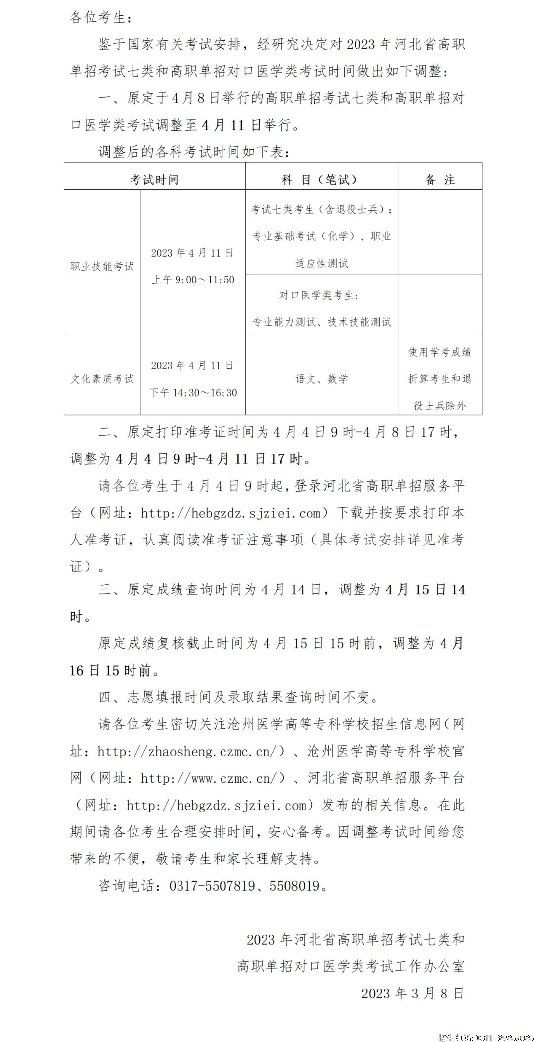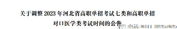 关于调整2023年河北省高职单招考试七类和高职单招对口医学类考试时间的公告
