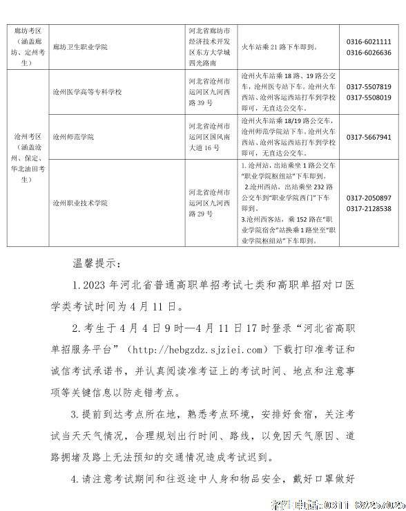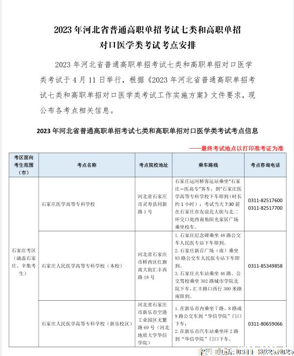 2023年河北省普通高职单招考试七类和高职单招对口医学类考试考点安排.