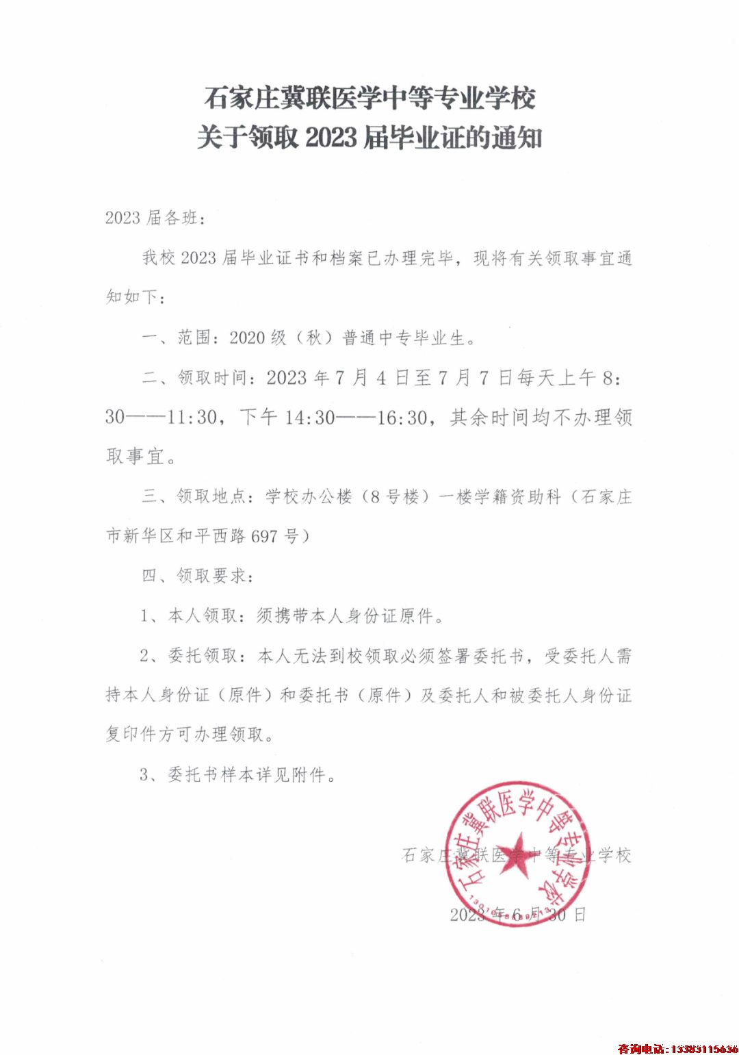 石家庄冀联医学中等专业学校关于领取2023届毕业证的通知