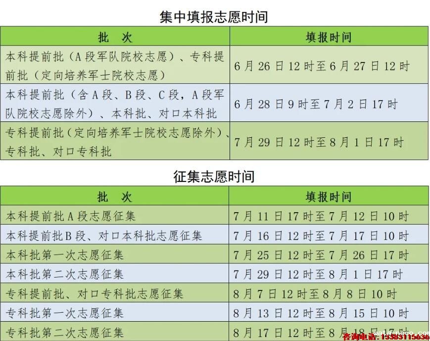 成绩查询时间:6月23日零时 高考成绩查询系统入口: https://www.nm.zsks.cn/ 志愿填报时间: 2024年我区高校招生录取共设置9个批次。其中,本科层次共设置7个批次:本科提前批A、本科提前批B、本科提前批C、本科一批、本科一批B、本科二批、本科二批B。专科层次共设置2个批次:专科提前批和高职高专批。 1.本科提前批A:安排普通类、艺术类、体育类院校(或专业)计划。 2.本科提前批B:安排普通类、艺术类、体育类院校(或专业)计划。 3.本科提前批C:安排民办院校、独立学院的艺术类和体育类本科专业计划。 4.本科一批:安排原“211”院校和我区批准的生源较好院校普通类本科招生计划,包括普通类计划,蒙授文理科的少数民族预科班、民族班,边防军人子女预科班计划。 5.本科一批B:安排本科一批院校文理科的少数民族预科班、民族班、定向和非西藏生源定向西藏就业计划。 6.本科二批:安排普通类其他院校和高职对口招生本科招生计划,包括普通类计划,蒙授文理科的少数民族预科班、民族班,高职对口招生本科计划。 7.本科二批B:安排本科二批院校文理科的少数民族预科班、民族班、定向和边防军人子女预科班计划。 8.专科提前批:安排军事、公安、司法行政警察类等院校(或专业)的普通类专科计划,艺术类和体育类专科计划。 9.高职高专批:安排专科提前批之外的普通类和高职对口招生的专科计划。