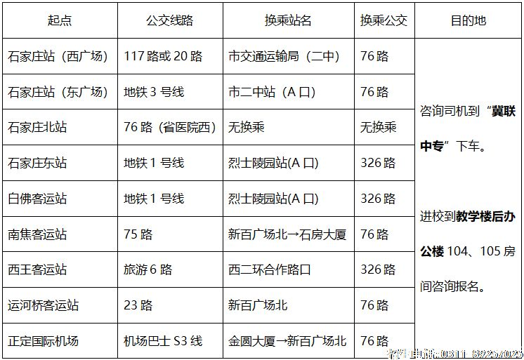 十一、你校的位置在哪里?怎么过去? 我校位于石家庄市内,和平西路697号。 交通四通八达:乘坐地铁、公交很方便。 十二、学校招办电话:0311-89257025、15383298687、13383115636微信同号